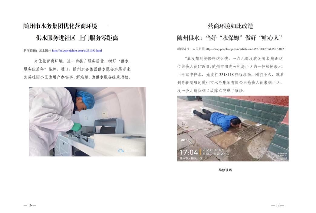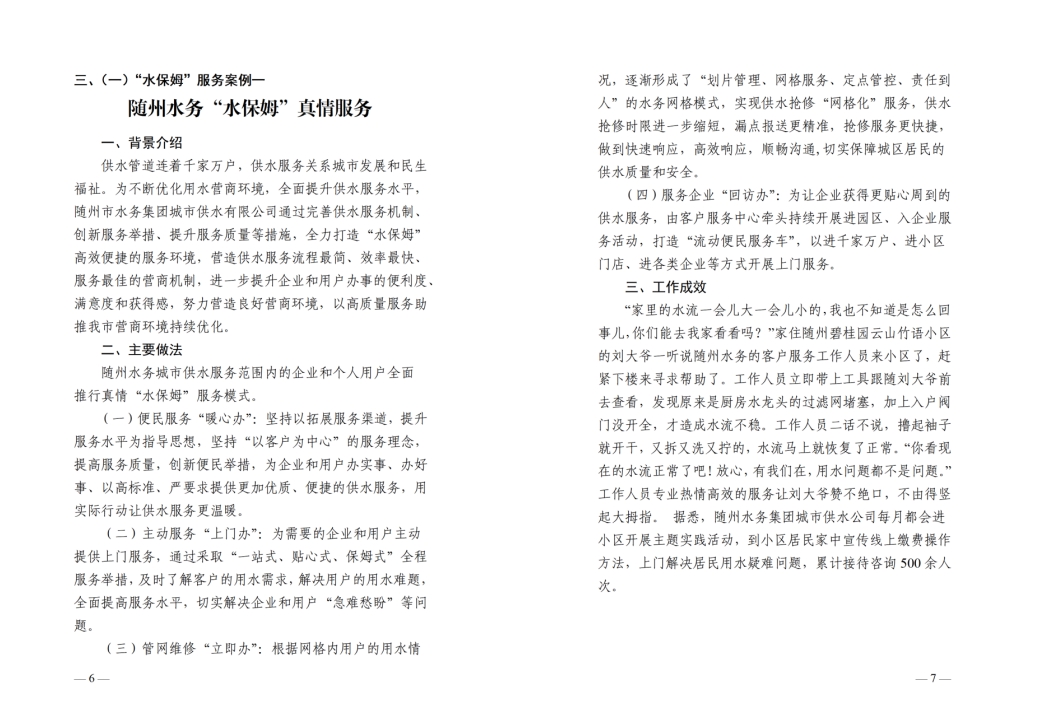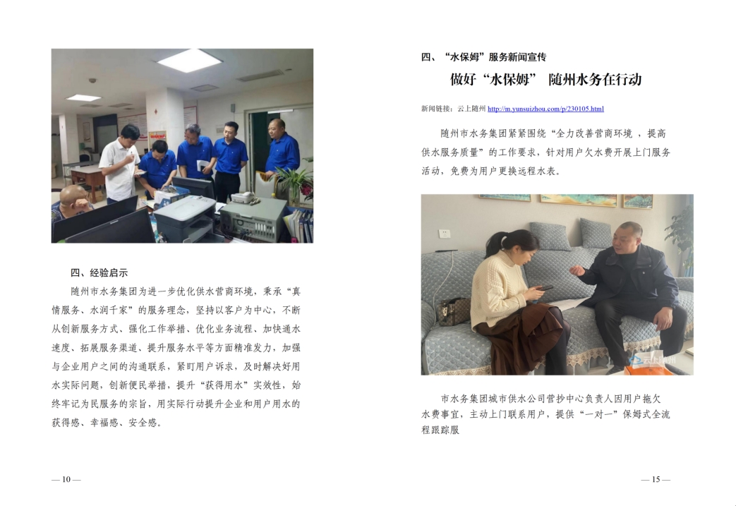 為全面提升供水服務水平,優(yōu)化供水營商環(huán)境,隨州水務集團推出“水保姆”供水服務新模式,建立“供水服務網格員”隊伍,通過開展清表核查、網格劃分、聯(lián)合社區(qū)共同解決用戶問題等亮點行動,讓百姓暖心,讓企業(yè)放心。